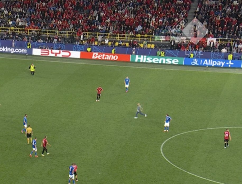 意大利vs阿尔巴尼亚有球迷冲进球场,比赛中断了一段时间