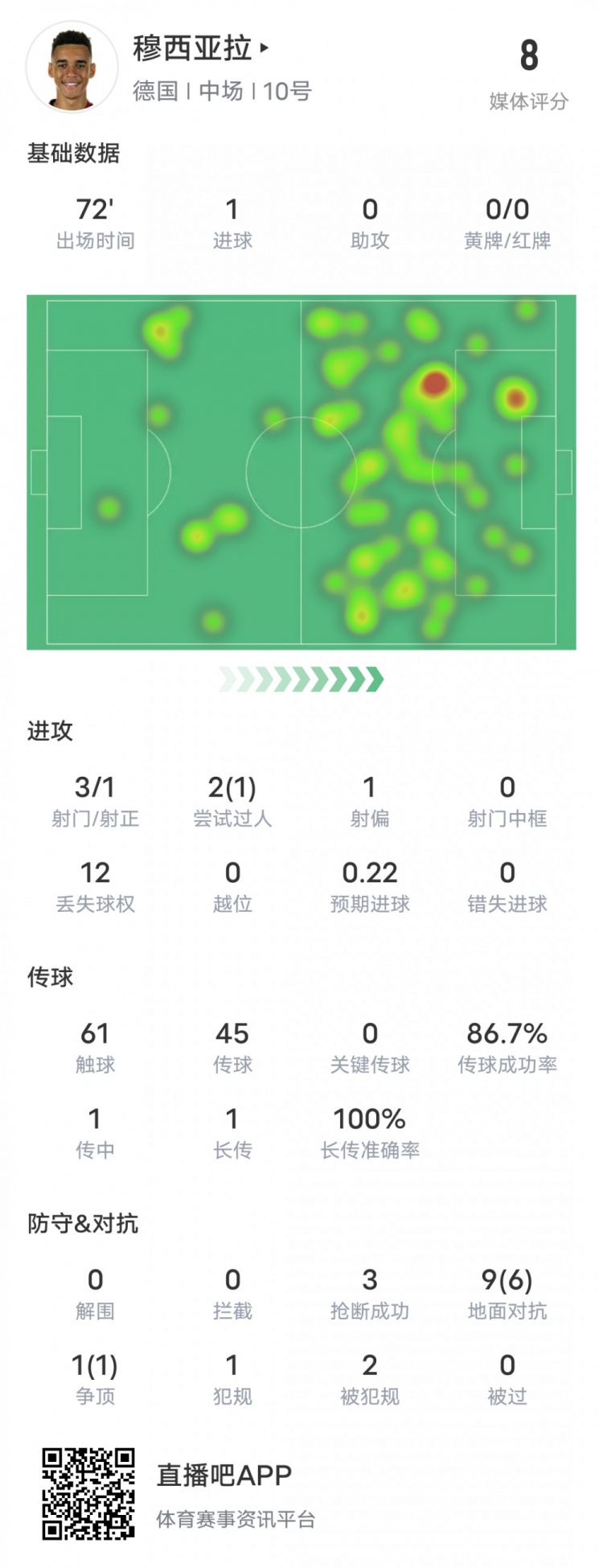 穆西亚拉本场比赛数据如下: