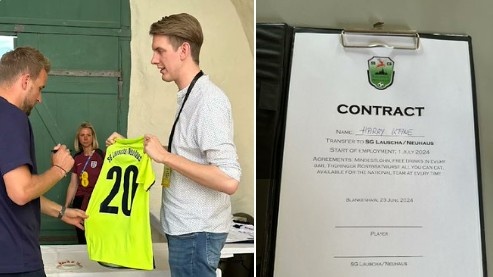 而在本场发布会前,一名当地的德国记者向凯恩送上了本地俱乐部(第7级别联赛)的球衣和合同,并表示:“你喜欢这里的环境,能想象居住在这里吗?我们有一支第7级别联赛的球队,他们向你提供了一份合同。”