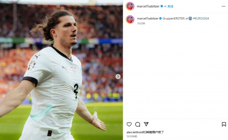 6月26日讯 奥地利在本轮欧洲杯3-2击败荷兰,打进制胜球的萨比策在赛后发文纪念。