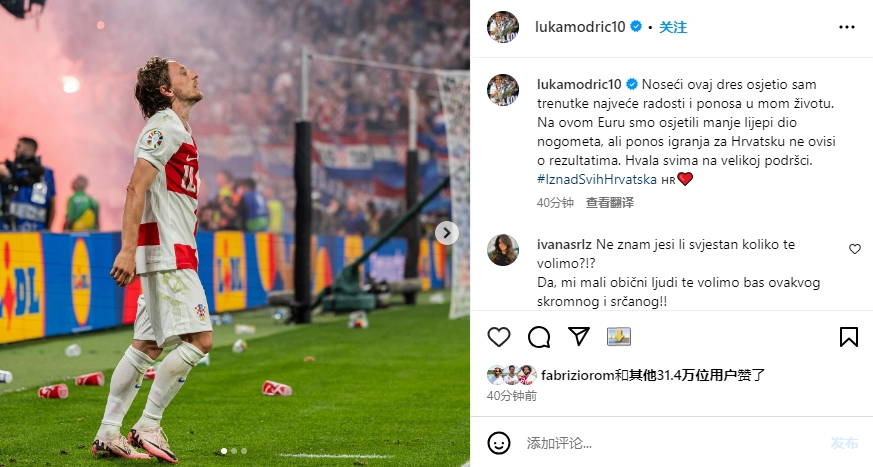 莫德里奇:“穿着这件球衣,我感受了人生中最快乐最自豪的时刻。在这届欧洲杯上,我们感受了足球中不那么美丽的部分,但为克罗地亚效力的自豪感并不取决于结果。感谢大家的大力支持。”