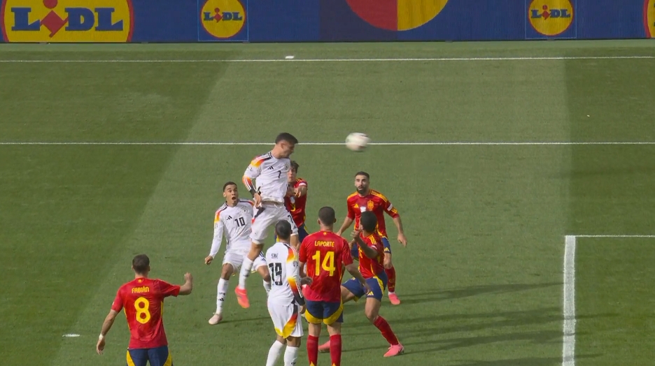 07月06日讯 西班牙vs德国第21分钟,基米希传中,哈弗茨高高跃起头球攻门被西蒙没收。