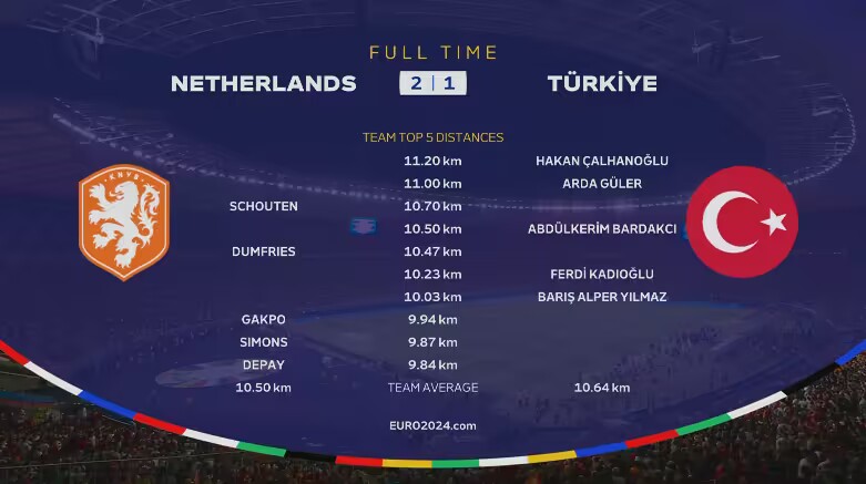 7月7日讯 在欧洲杯1/4决赛,荷兰2-1击败土耳其,以下为双方球员本场跑动距离榜: