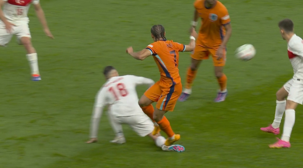 07月07日讯 欧洲杯荷兰vs土耳其第30分钟,西蒙斯踩踏穆尔杜小腿!裁判向西蒙斯出示黄牌!