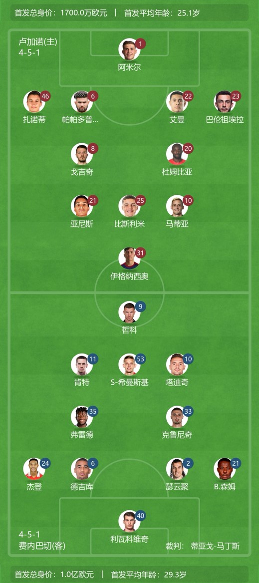 费内巴切首发总身价高达1亿欧,卢加诺仅1700万欧