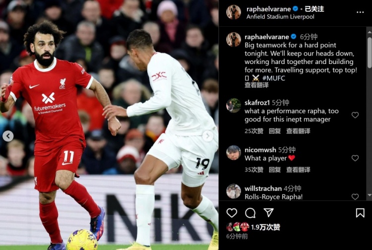 12月18日讯 本轮英超焦点战,曼联客场0-0战平利物浦。本场比赛,瓦拉内首发出战并打满全场,发挥出色。赛后,他更新了社交媒体动态,感谢了曼联球迷和全队的努力。