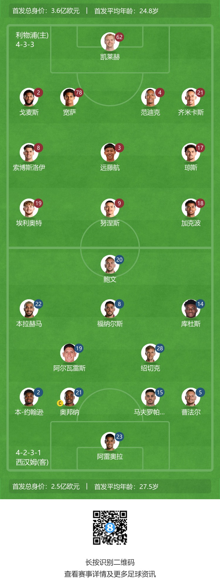 利物浦首发:62-凯莱赫、2-戈麦斯、78-宽萨、4-范迪克、21-齐米卡斯、8-索博斯洛伊、3-远藤航、17-琼斯、19-埃利奥特、9-努涅斯、18-加克波
